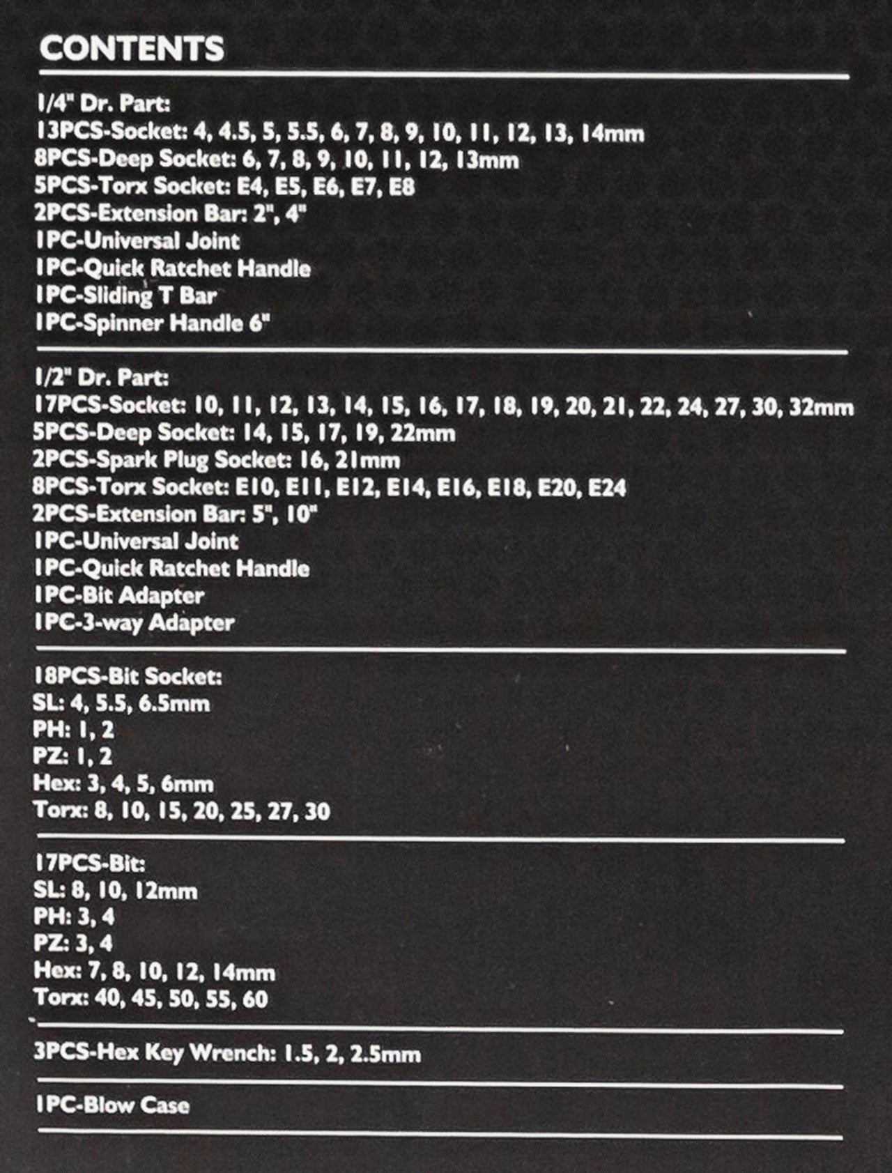 - 17 PCS SOCKET: 10, 11, 12, 13, 14, 15, 16, 17, 18, 19, 20, 21, 24, 27, 30, 32 MM
