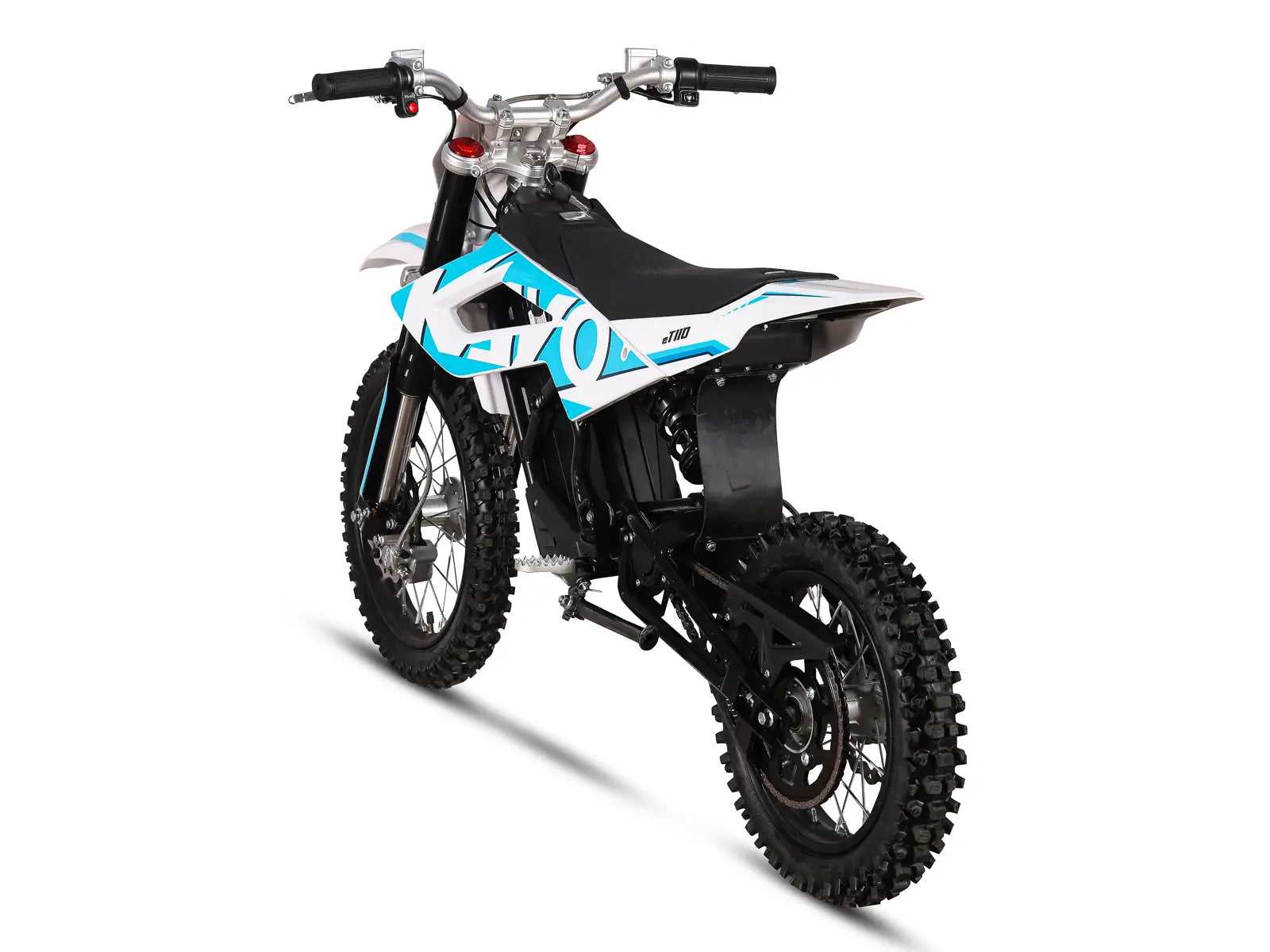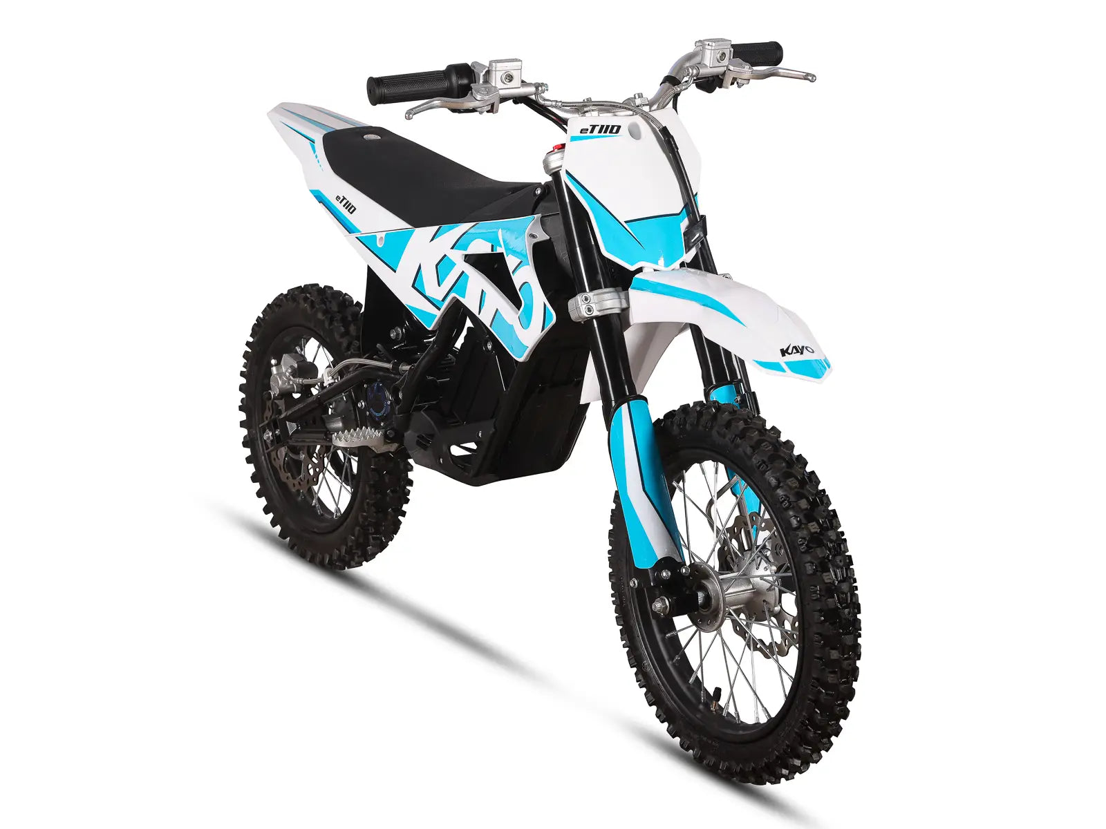 The eT110 is Kayos first serious electric dirt / pit bike (14/12 configuration) aimed at youth riders and teens. Boasting peak power of 3.5 kw it’s got plenty of grunt and will accelerate quickly to a top speed of 34 MPH. Featuring 3 x speed / power settings and a patented quick-change battery system Kayo have put some considerable effort into the design of this bike.