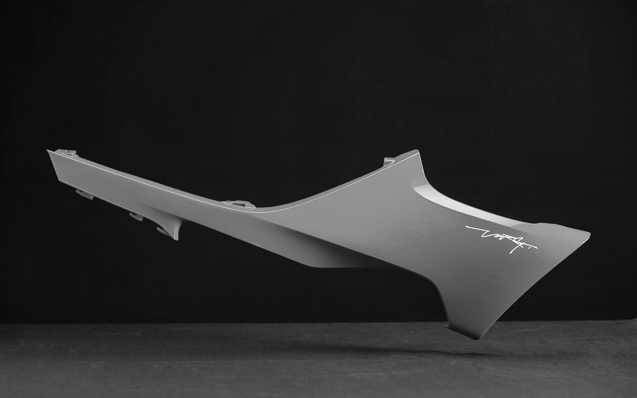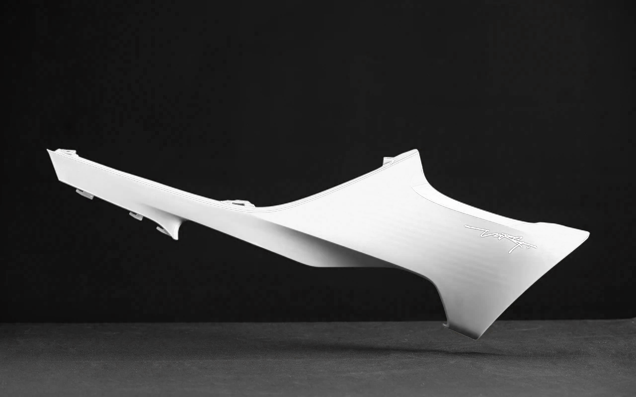 The front side spoilers are created with Stark’s ribbed design to reduce the use of plastic and weight but maintaining strength thanks to the variable thickness. They clip into the rear fender and screw into the seat base. They are made from Polypropylene, attached with four bolts. and carry the in-mold Stark logo. There are three different colors: Stark Red, Forest Gray and Snow White.